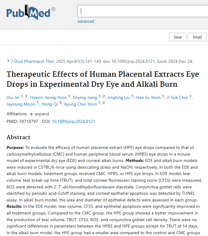 Therapeutic Effects of Human Placental Extracts Eye Drops in Experimental Dry Eye and Alkali Burn