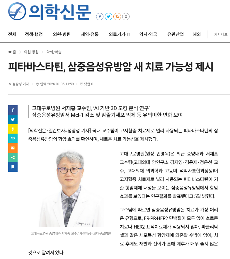 서재홍 교수팀, '피타바스타틴' 삼중음성유방암 새 치료 가능성 제시