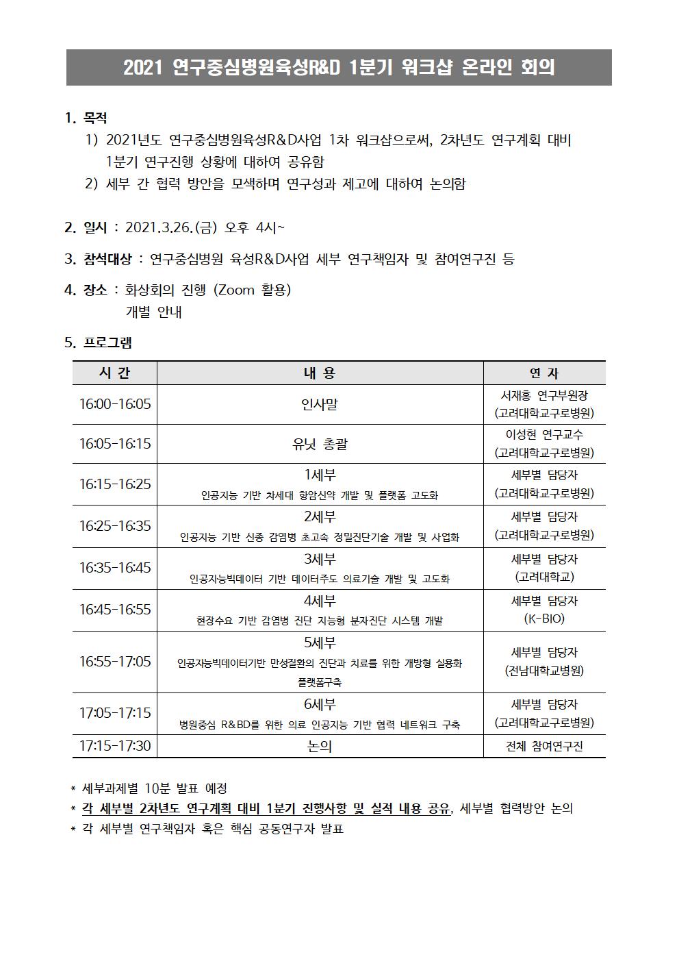 고려대학교 구로병원 연구중심병원육성R&D사업 2차년도 1분기 정기 워크숍 진행 안내(3/26)