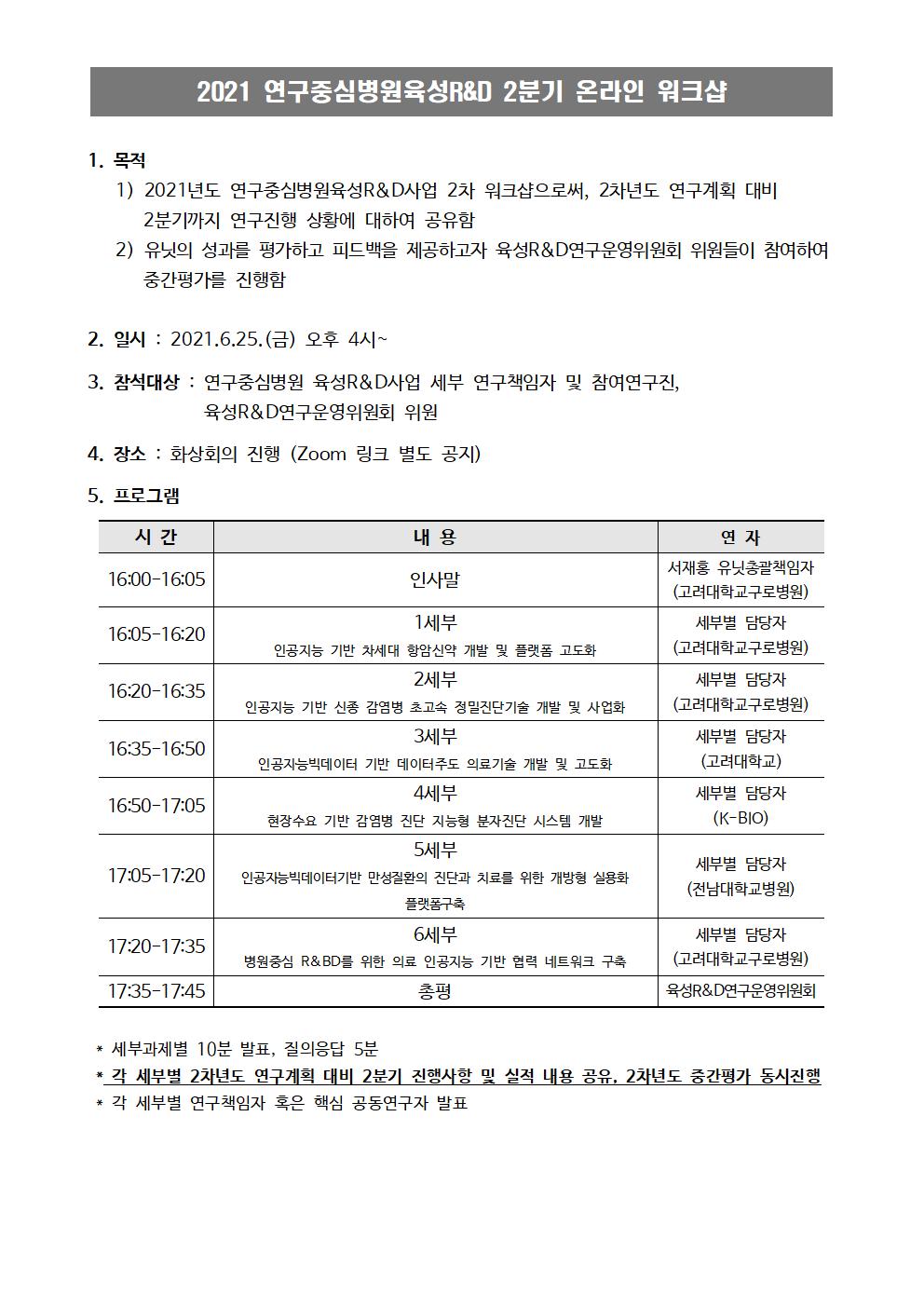 고려대학교 구로병원 연구중심병원육성R&D사업 2차년도 2분기 정기 워크숍 진행 안내(6/25)