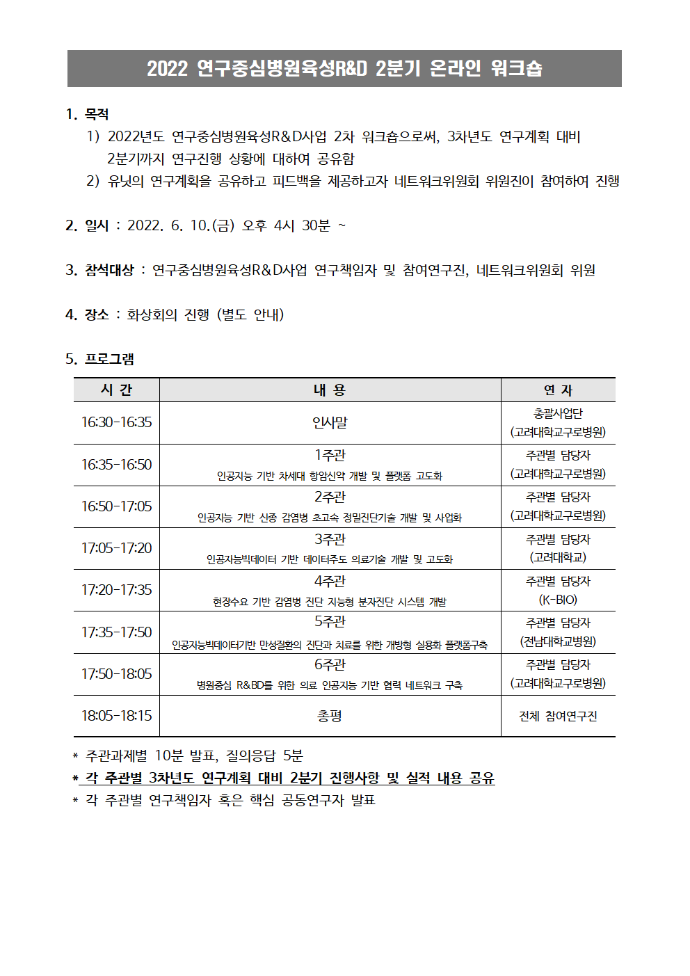 고려대학교 구로병원 연구중심병원육성R&D사업 3차년도 2분기 정기 워크숍 안내(6/10)