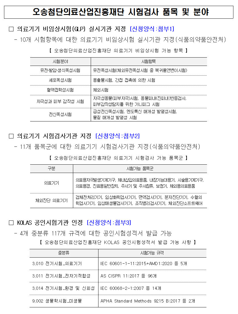 우리 사업단 공동참여기관인 K-BIO HEALTH(오송첨단의료산업진흥재단)는 식품의약품안전처 지정 의료기기 시험검사 기관, 한국인정기구(KOLAS)의 공인시험기관으로 인정받아 품목허가를 위한 시험검사, 성능·신뢰성평가 및 전임상시험 등의 시험평가 서비스를 운영하고 있습니다. 첨부파일과 상세내용을 확인하시고 서비스 문의부터 신청까지 어떠한 내용이든 문의처로 편하게 연락주시기 바랍니다. 많은 관심 부탁드립니다. 감사합니다.