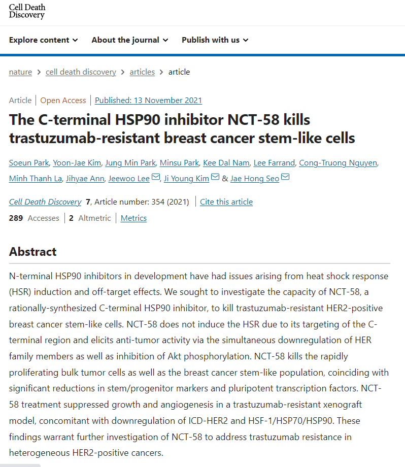 [논문] The C-terminal HSP90 inhibitor NCT-58 kills trastuzumab-resistant breast cancer stem-like