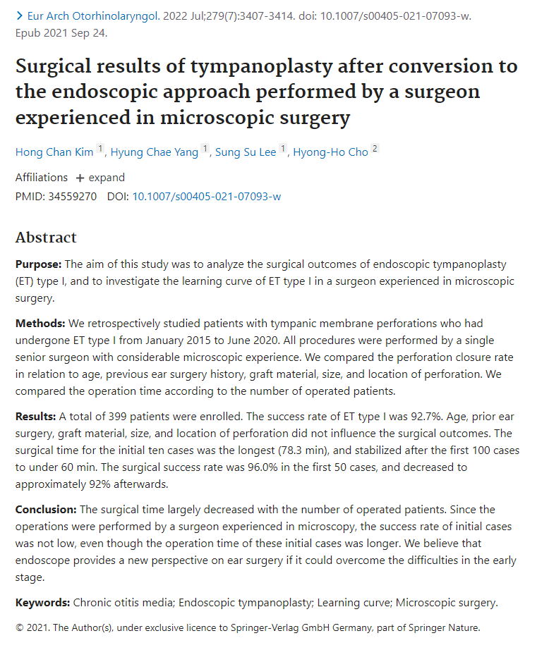 Surgical results of tympanoplasty after conversion to the endoscopic approach performed by a surgeon