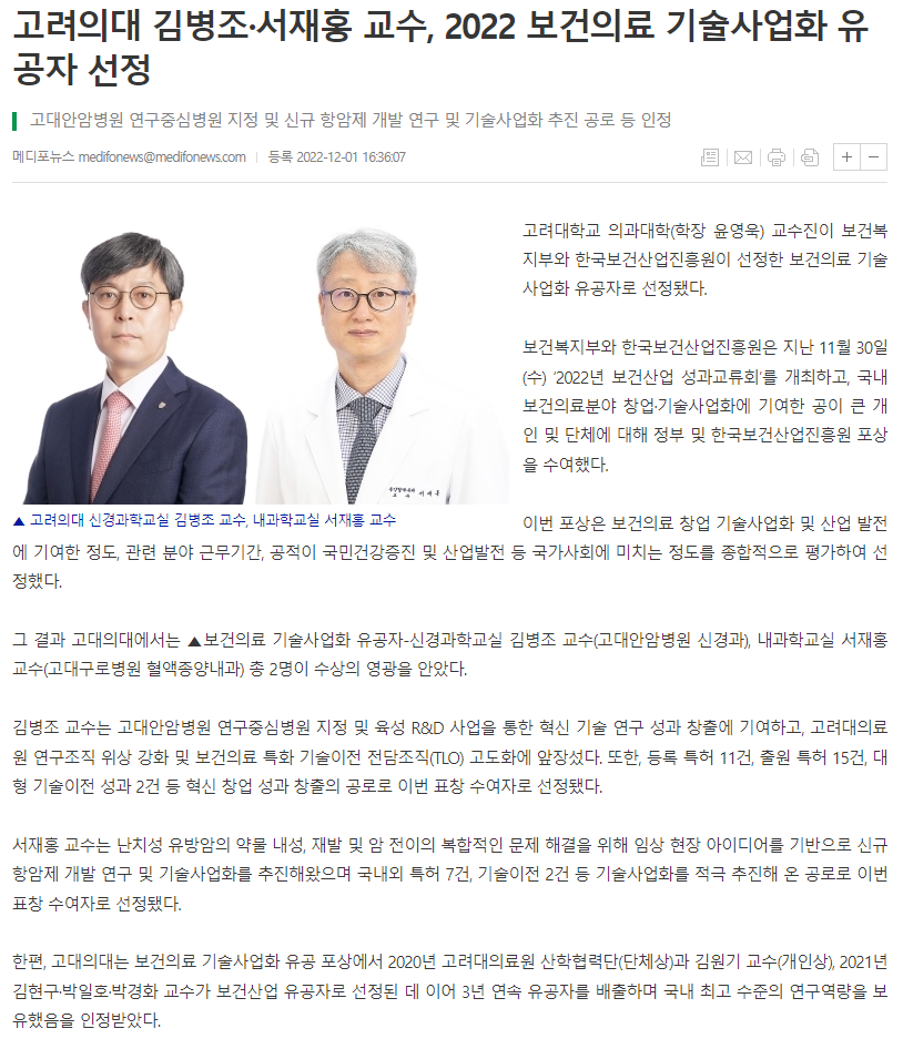 서재홍 고대구로병원 교수, 2022 보건의료 기술사업화 유공 보건복지부장관상 수상