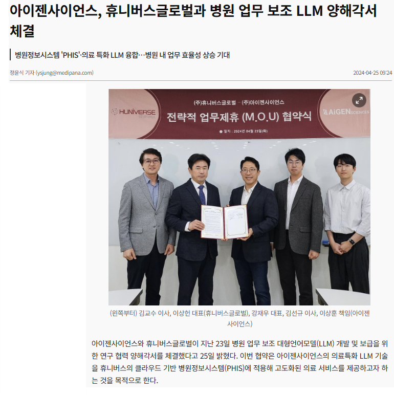 3주관 참여기업 아이젠사이언스, 휴니버스글로벌과 병원 업무 보조 LLM 양해각서 체결