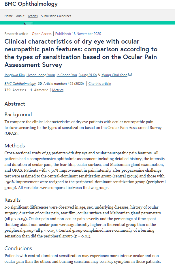 [논문] Clinical characteristics of dry eye with ocular neuropathic pain features: comparison acc