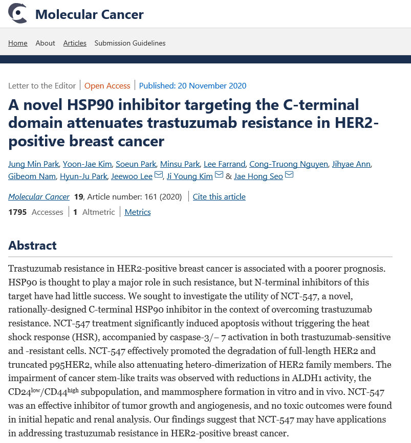 [논문] A novel HSP90 inhibitor targeting the C-terminal domain attenuates trastuzumab resistance