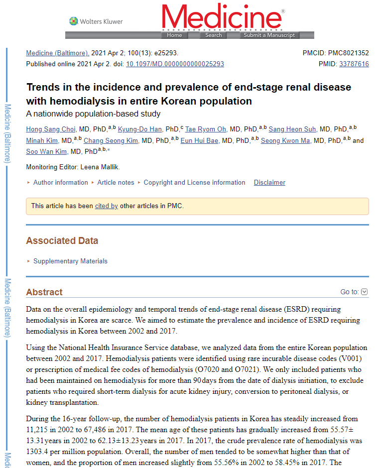 [논문] Trends in the incidence and prevalence of end-stage renal disease with hemodialysis in en