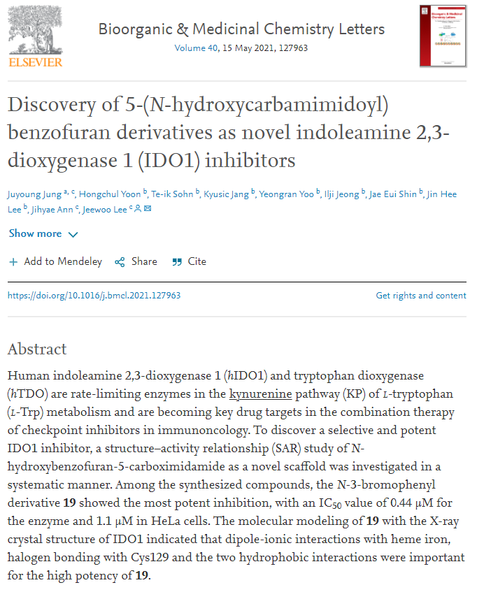 [논문] Discovery of 5-(N-hydroxycarbamimidoyl) benzofuran derivatives as novel indoleamine 2,3-d