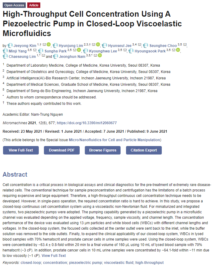 [논문] High-throughput cell concentration using a piezoelectric pump in closed-loop viscoelastic