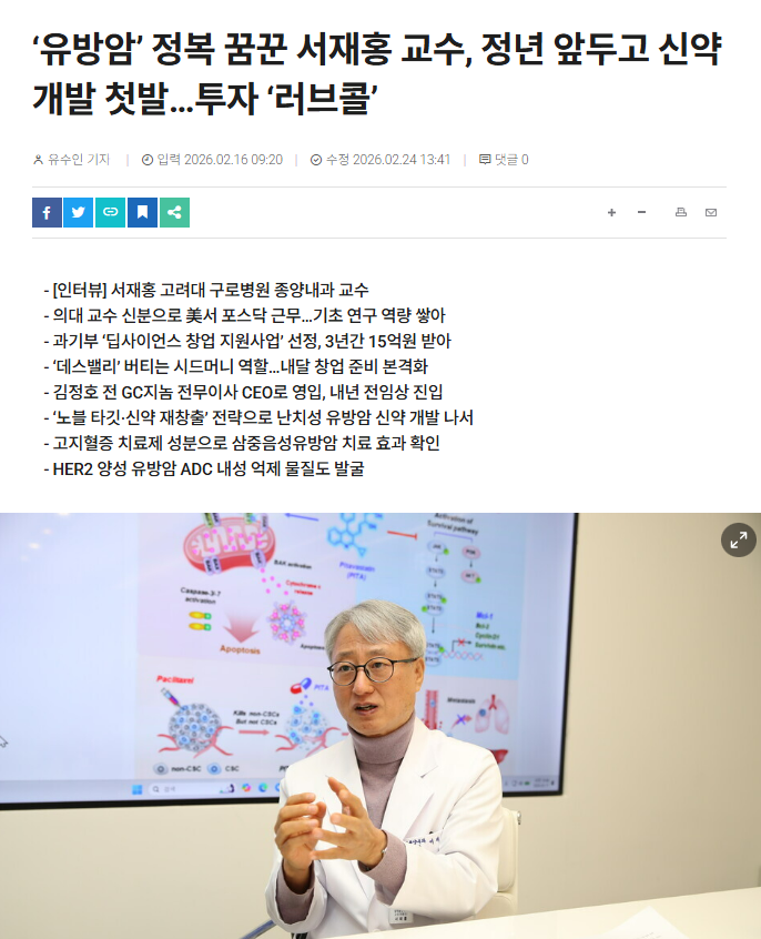‘유방암’ 정복 꿈꾼 서재홍 교수, 정년 앞두고 신약 개발 첫발…투자 ‘러브콜’
